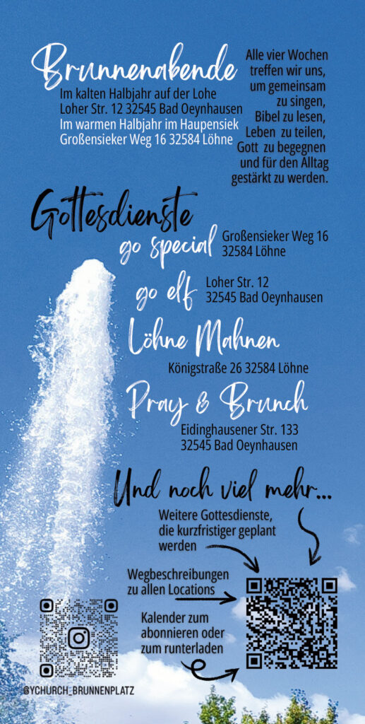 Hej, du hast den Brunnenplatz gefunden! Hier findest du die Angebote, die dir regelmäßig guten geistlichen Input geben: Neben den Brunnenabenden sind das bisher in erster Linie Gottesdienste. Wir haben dir eine gute Auswahl zusammengestellt.